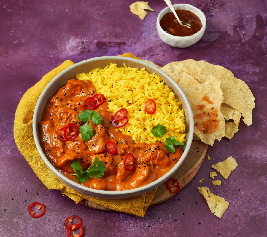 Tender chunks of chicken tikka in an indulgent curry sauce with single cream, unsalted butter, tomato puree, garlic, ginger, coriander and a selection of fragrant spices.